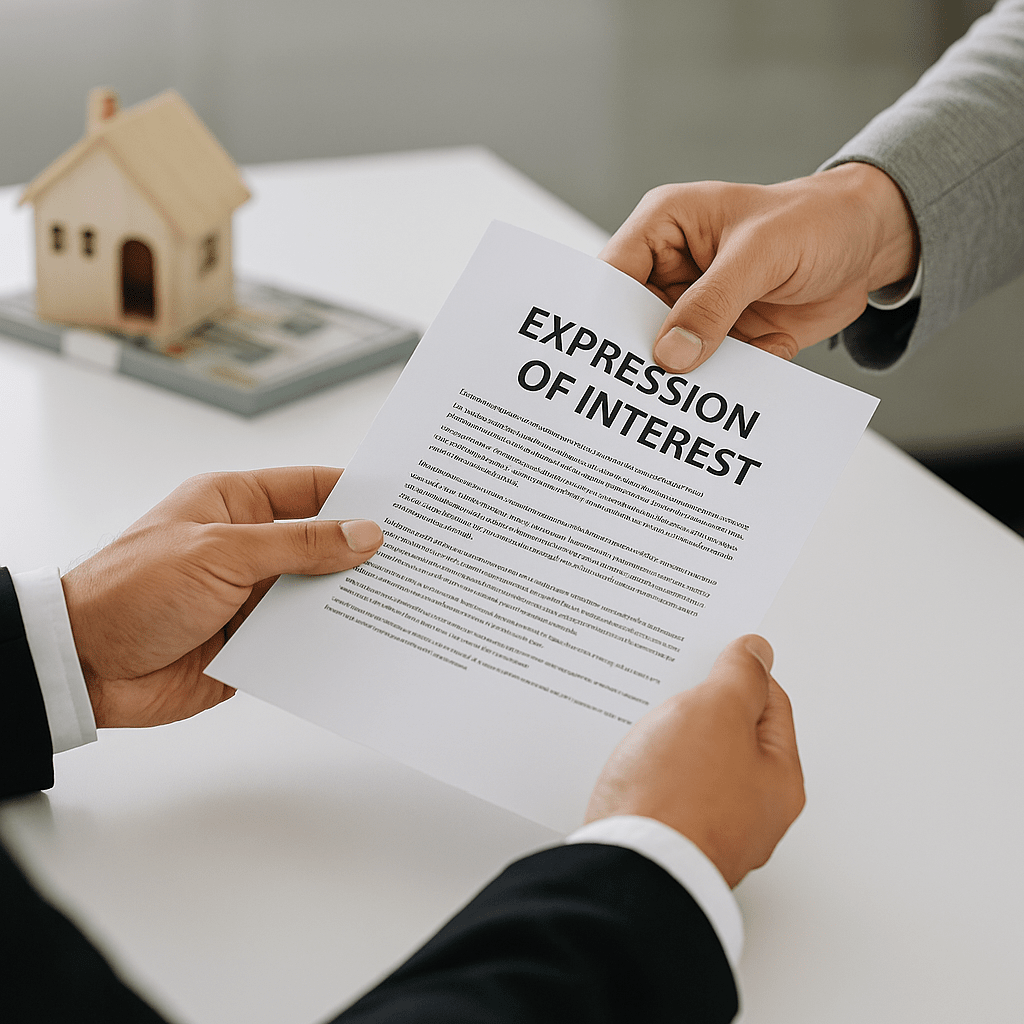An Expression of Interest (EOI) is a non-binding formal document submitted by prospective buyers or investors expressing serious interest in purchasing a property, usually off-plan or newly launched projects in Dubai and across the UAE.
